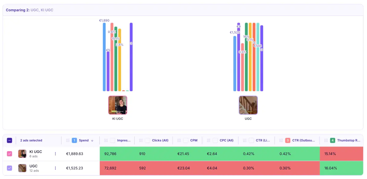 In einem A/B Test wurden AI UGC und UGC Creator mit komplett identischen Skript, Budget (2.000€ pro AdSet) und identischen AdSet Einstellungen, gegeneinander getestet.